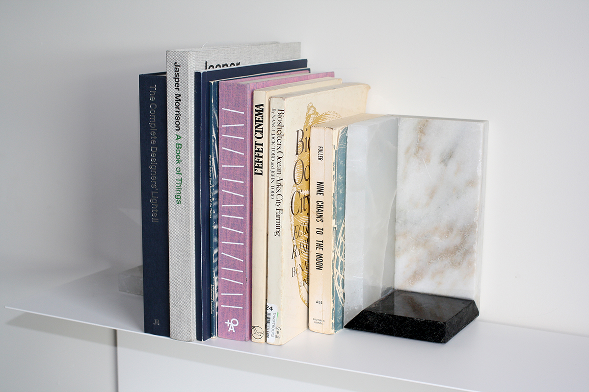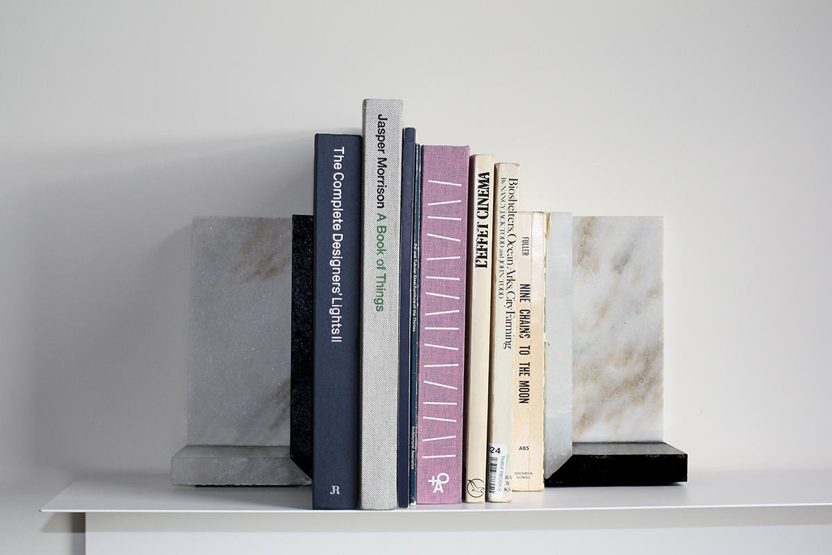 This set of bookends utilizing marble scraps left over from industrial manufacturing. Through a series of mitered cuts and stone epoxy, the bookends create an assemblage of geologic delight. The small rubber pad adhered to the bottom ensures they won't slip even when supporting your heaviest coffee table treasure.