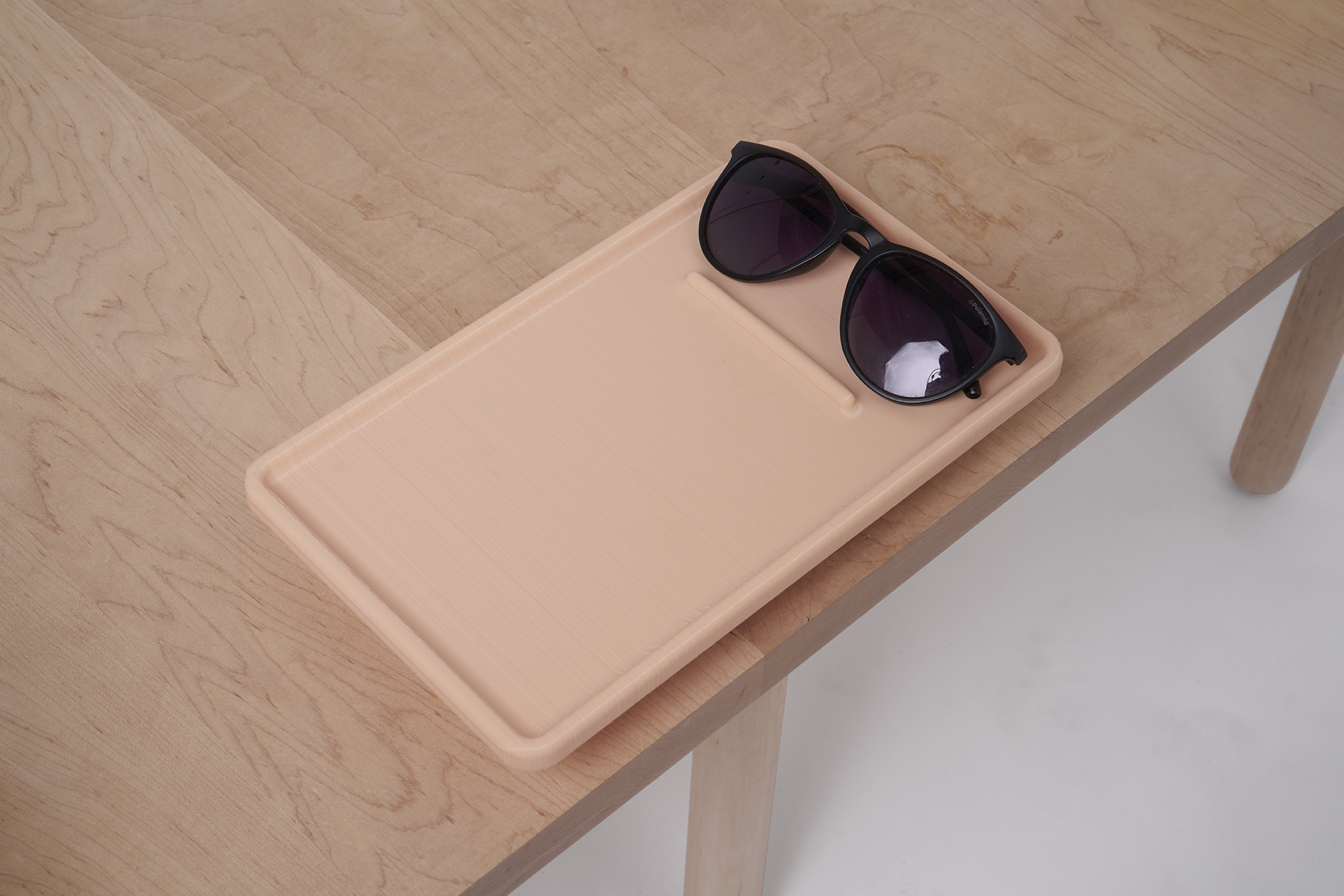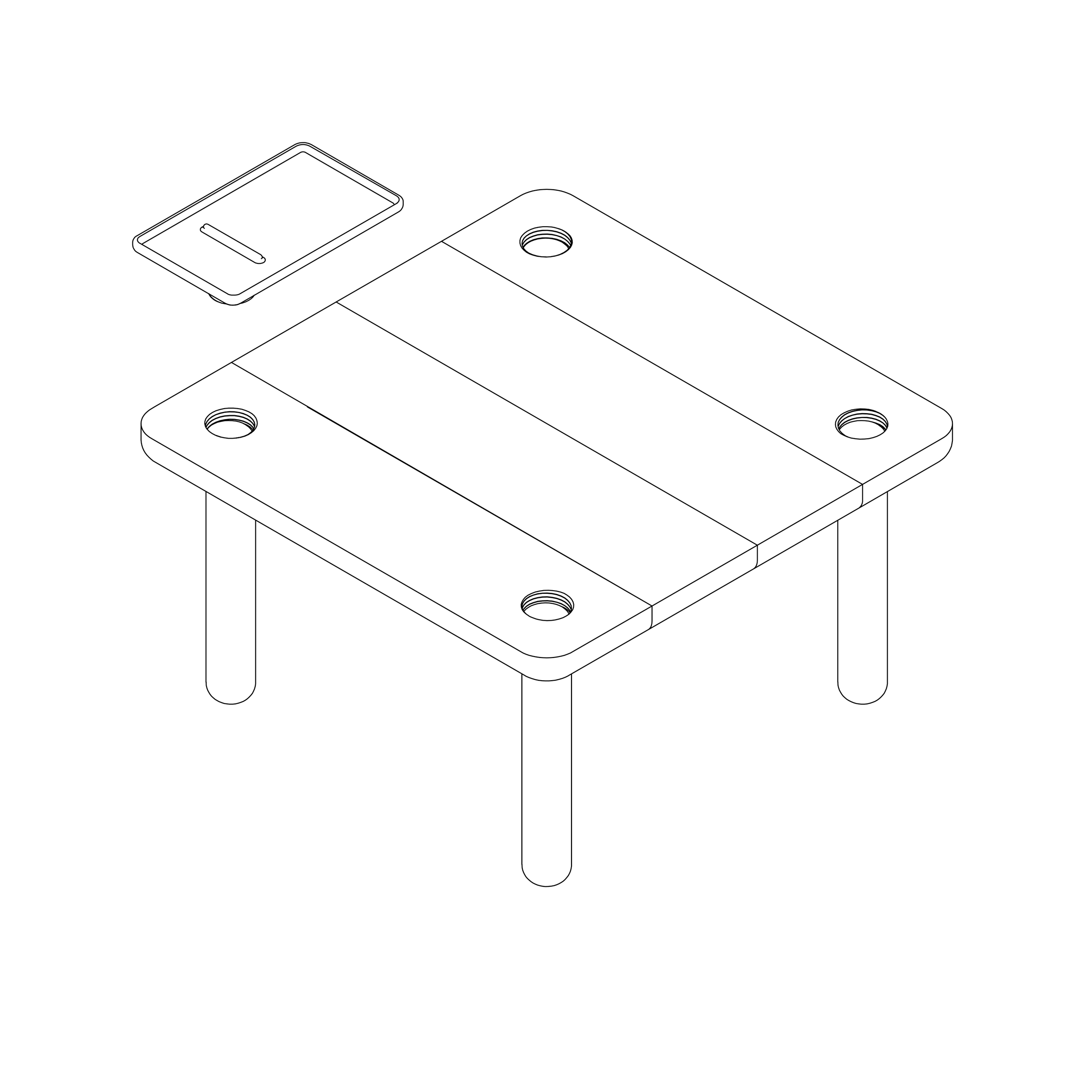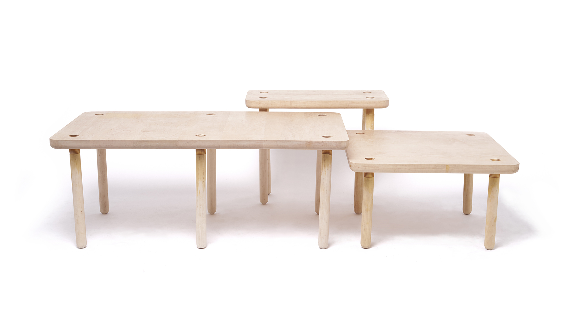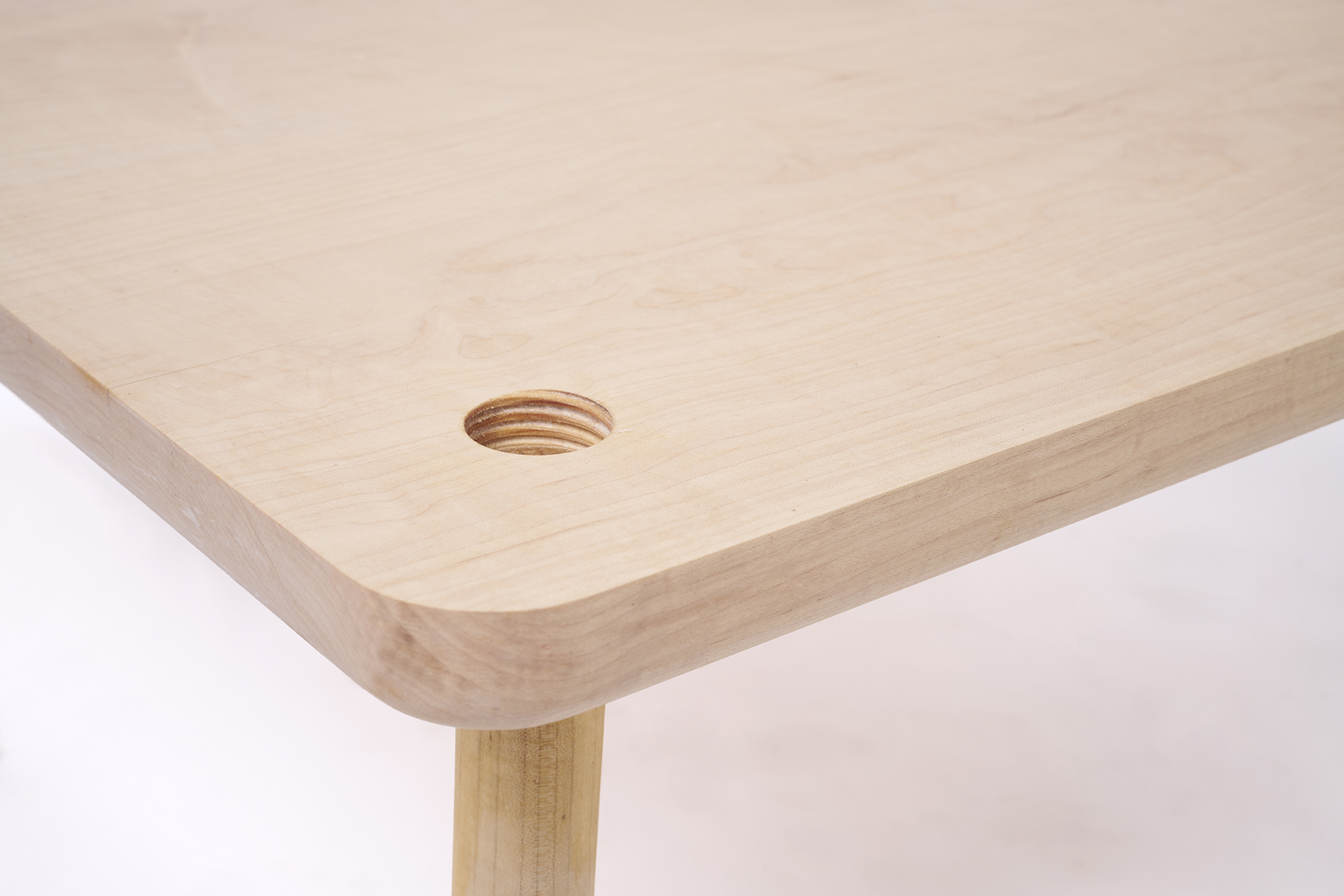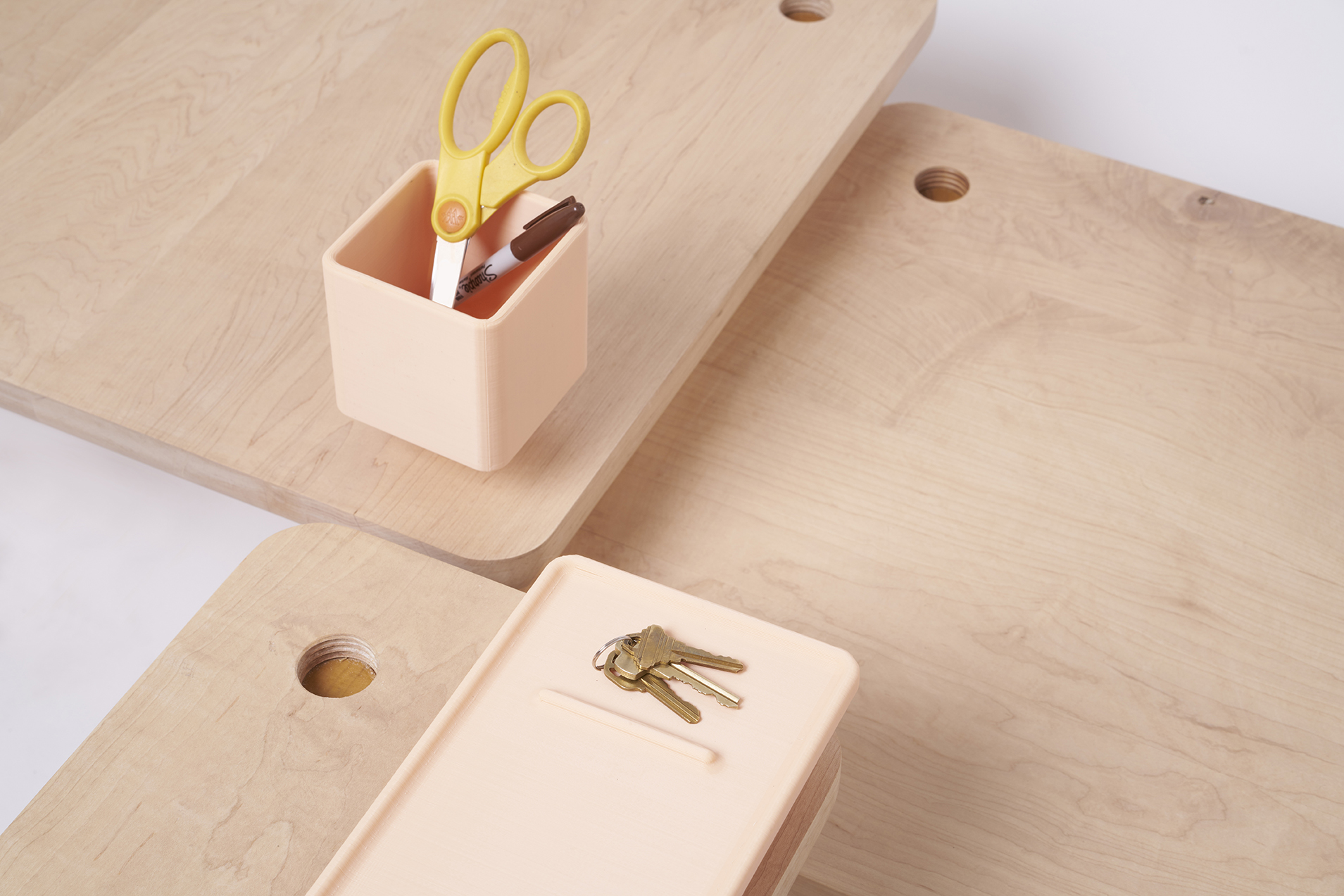 This system of tables and trays is fully customizable to suit its users’ needs. The solid maple tabletops feature threaded inserts for the legs and modular 3d printed trays. Through a variety of sizes, uses and positions, the integrated trays provide enough flexibility to satisfy a myriad of uses.